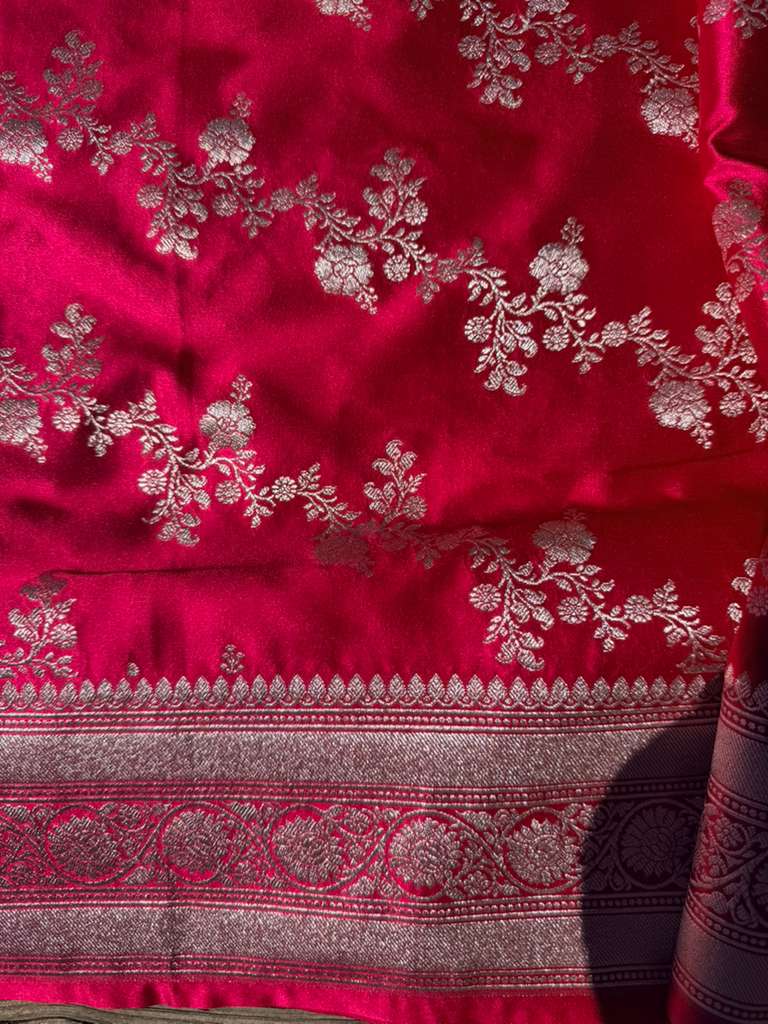 Mushroo silk saree in a vibrant Rani Pink. Known for its rich texture and subtle sheen, Mushroo silk beautifully blends the softness of silk with the durability of cotton, offering unmatched comfort without compromising on elegance.