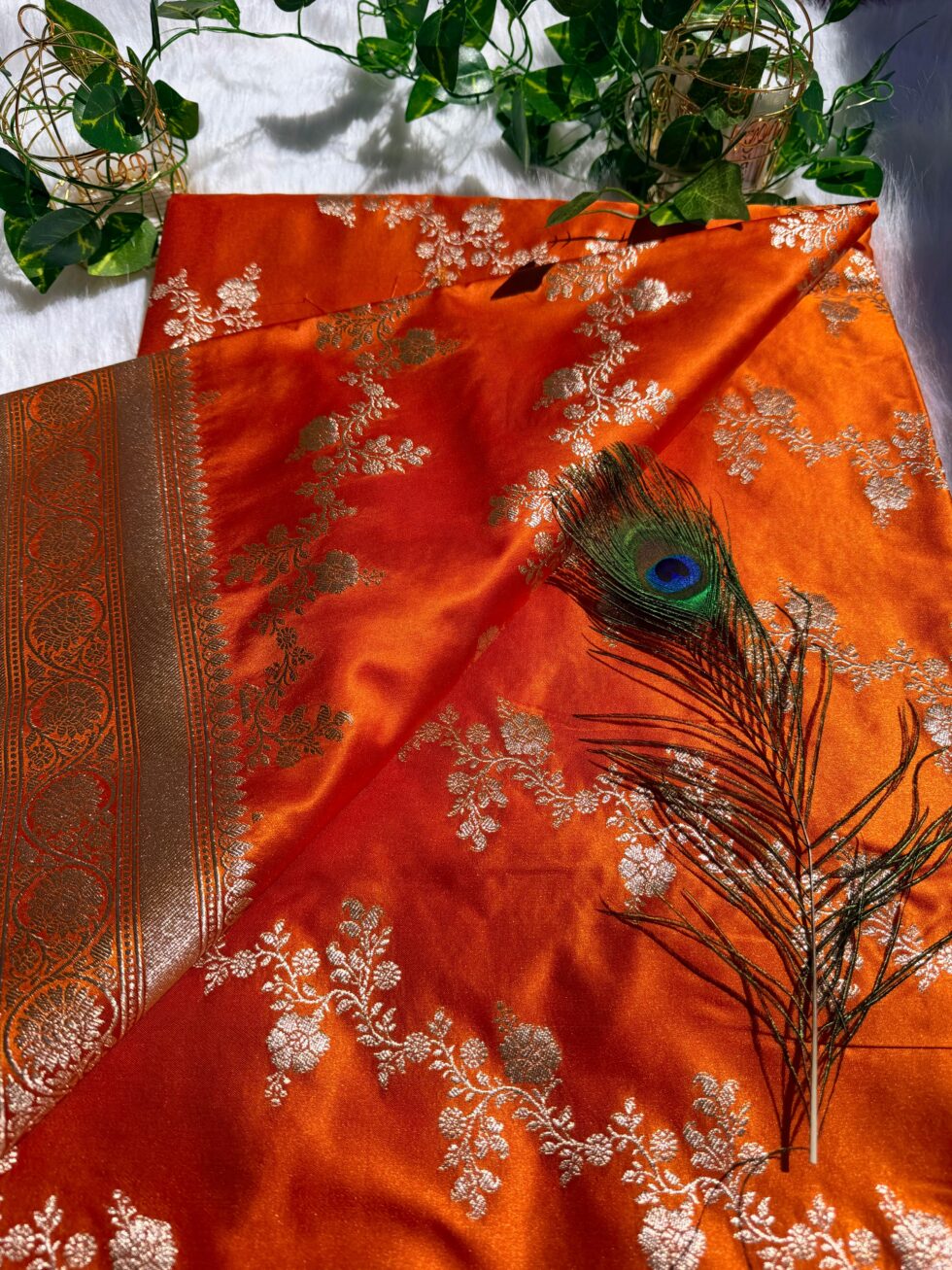 Mushroo silk saree in a vibrant orange hue. Known for its rich texture and subtle sheen, Mushroo silk beautifully blends the softness of silk with the durability of cotton, offering unmatched comfort without compromising on elegance.